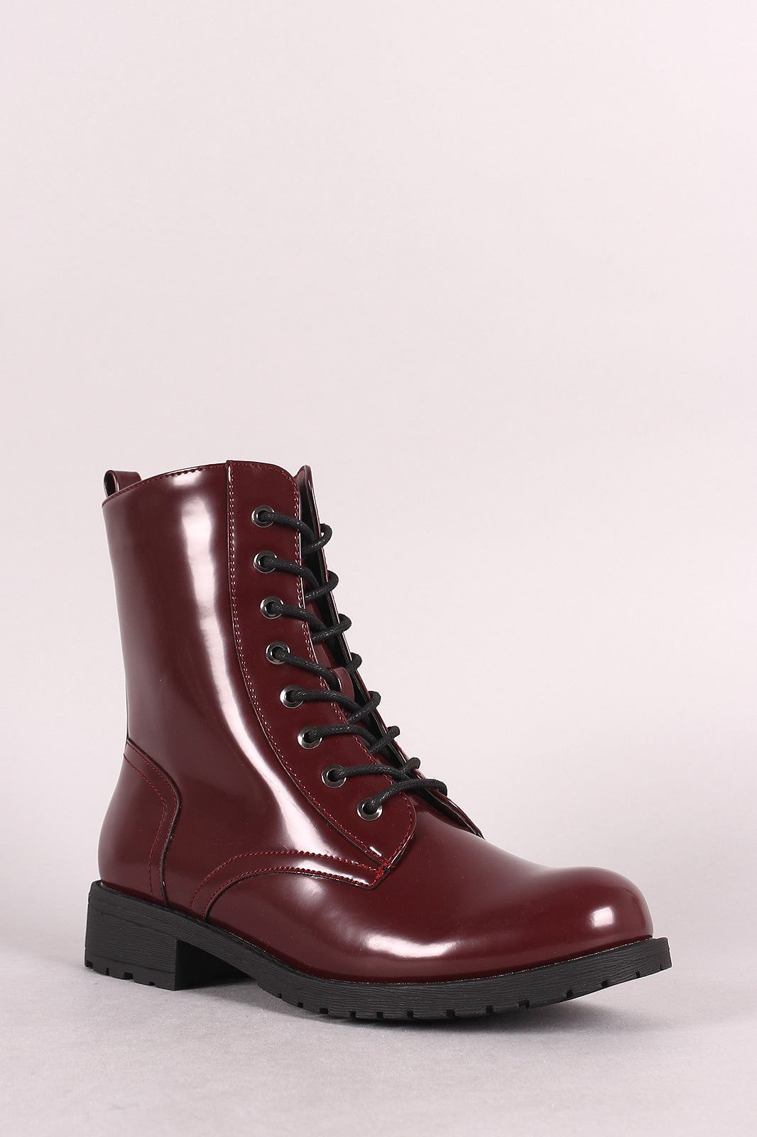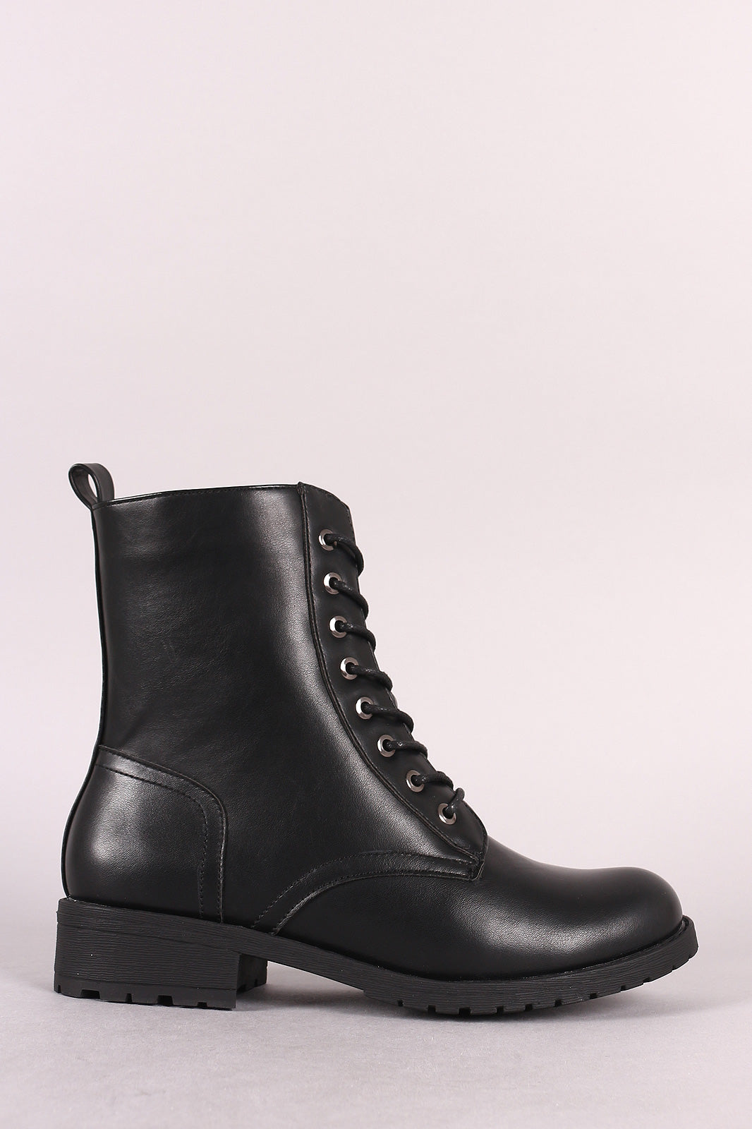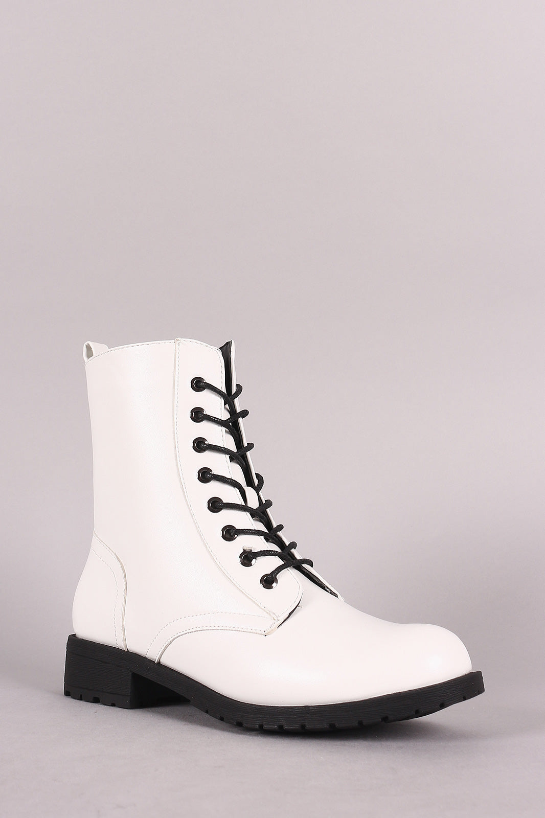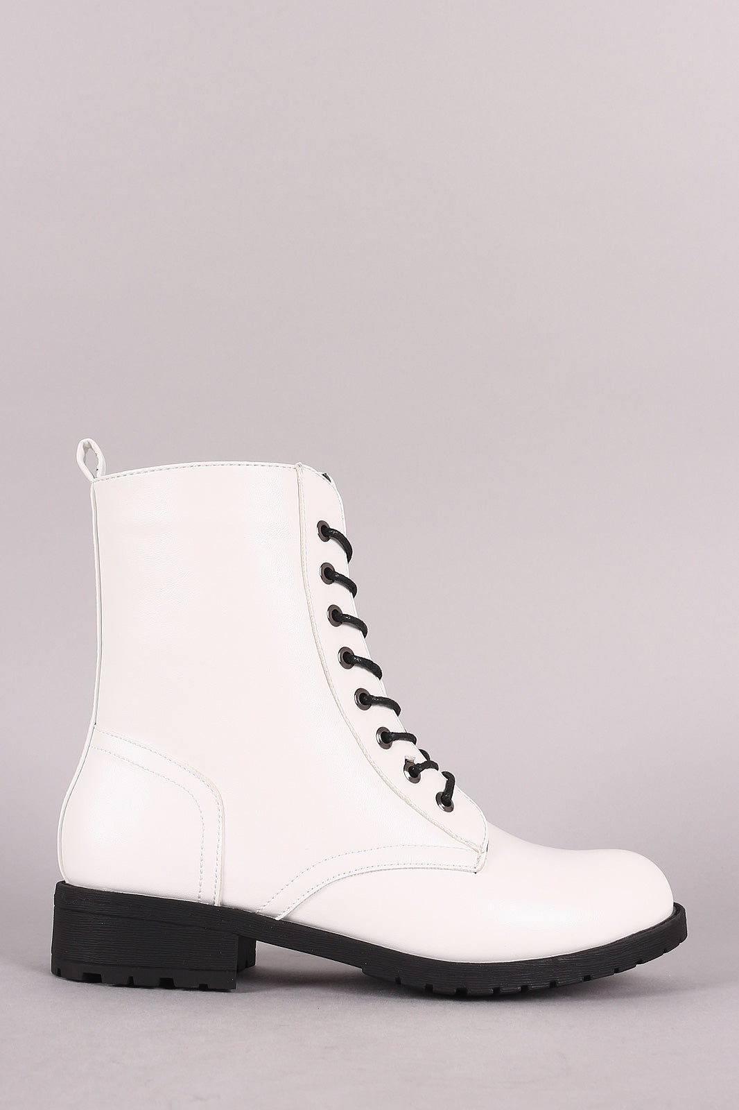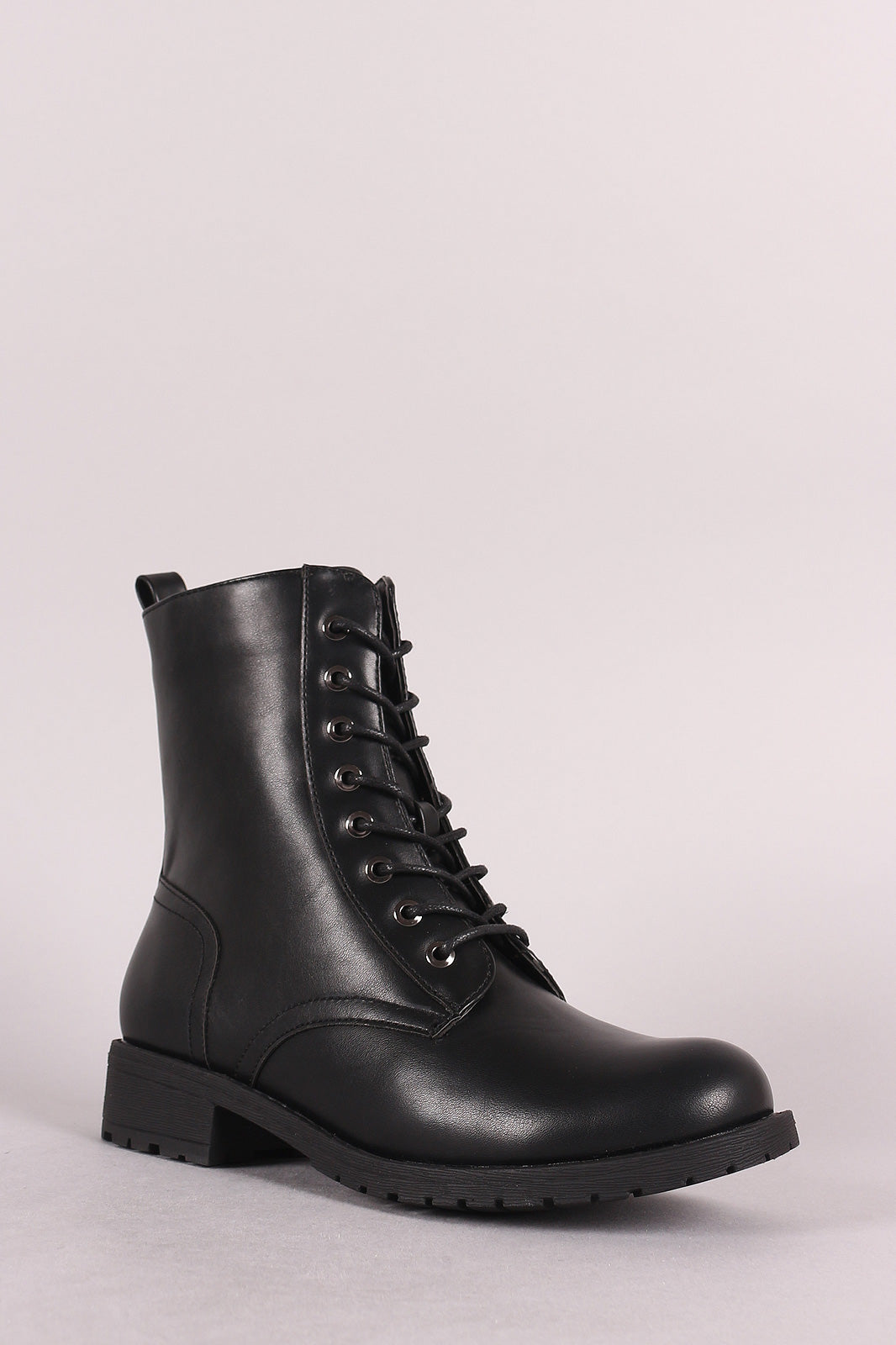 These combat boots features a vegan leather, round toe front, 8-hole lace-up design, pull tab back, and side zipper fastener.