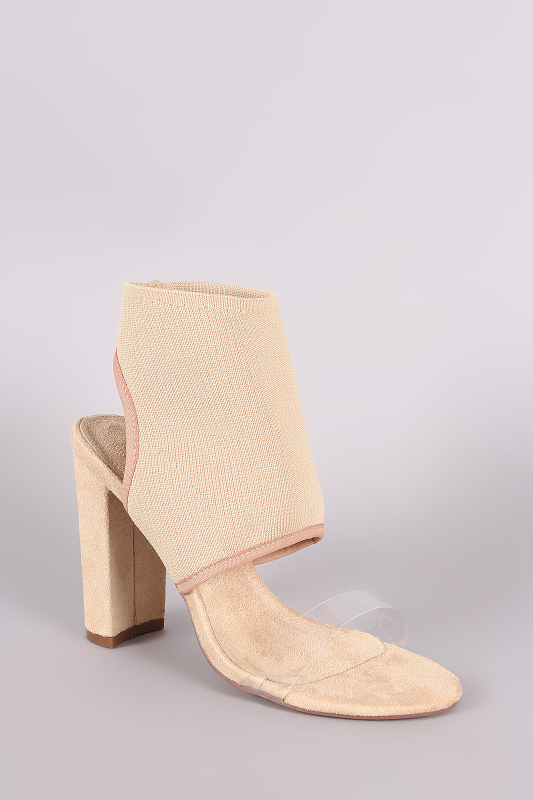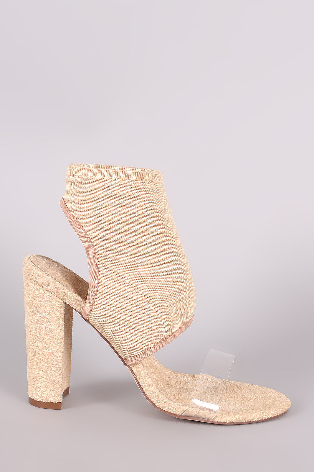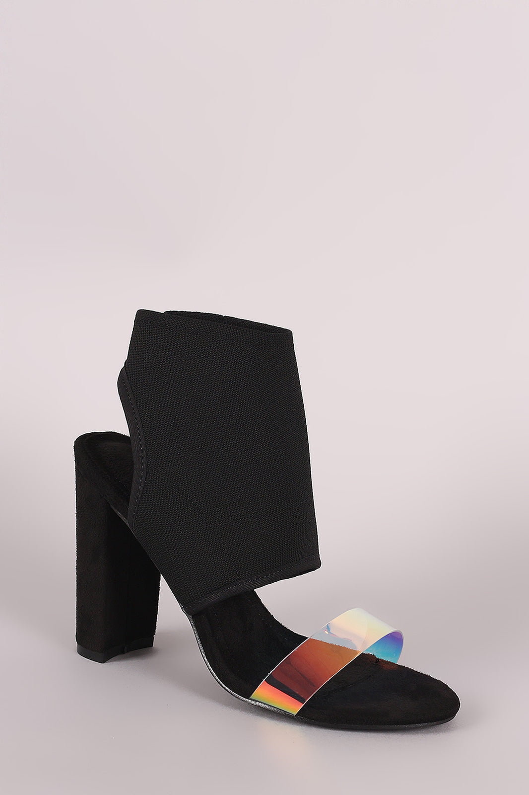 This open toe heel , features a clear cross strap at front and a fitted ankle cuff . Single sole on a chunky heel.