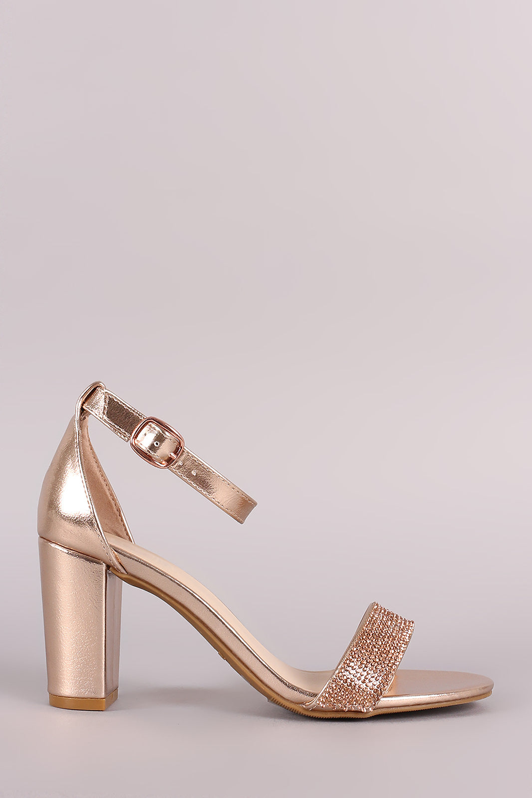 These lovely heels feature an open toe silhouette, single toe band with sparklingrhinestone accent, and an adjustable buckle ankle strap. Finished with a chunky wrapped heel and lightly padded insole.